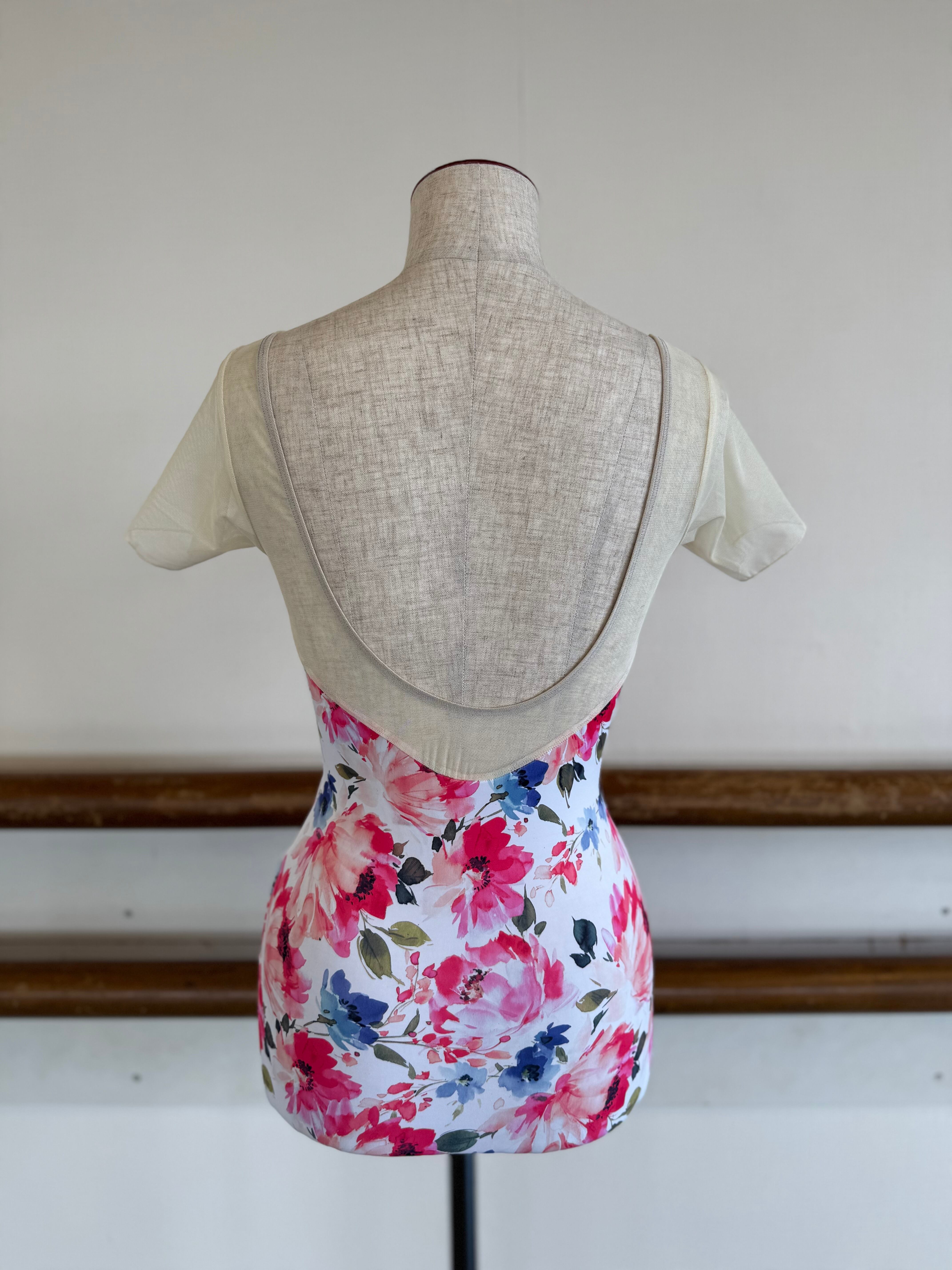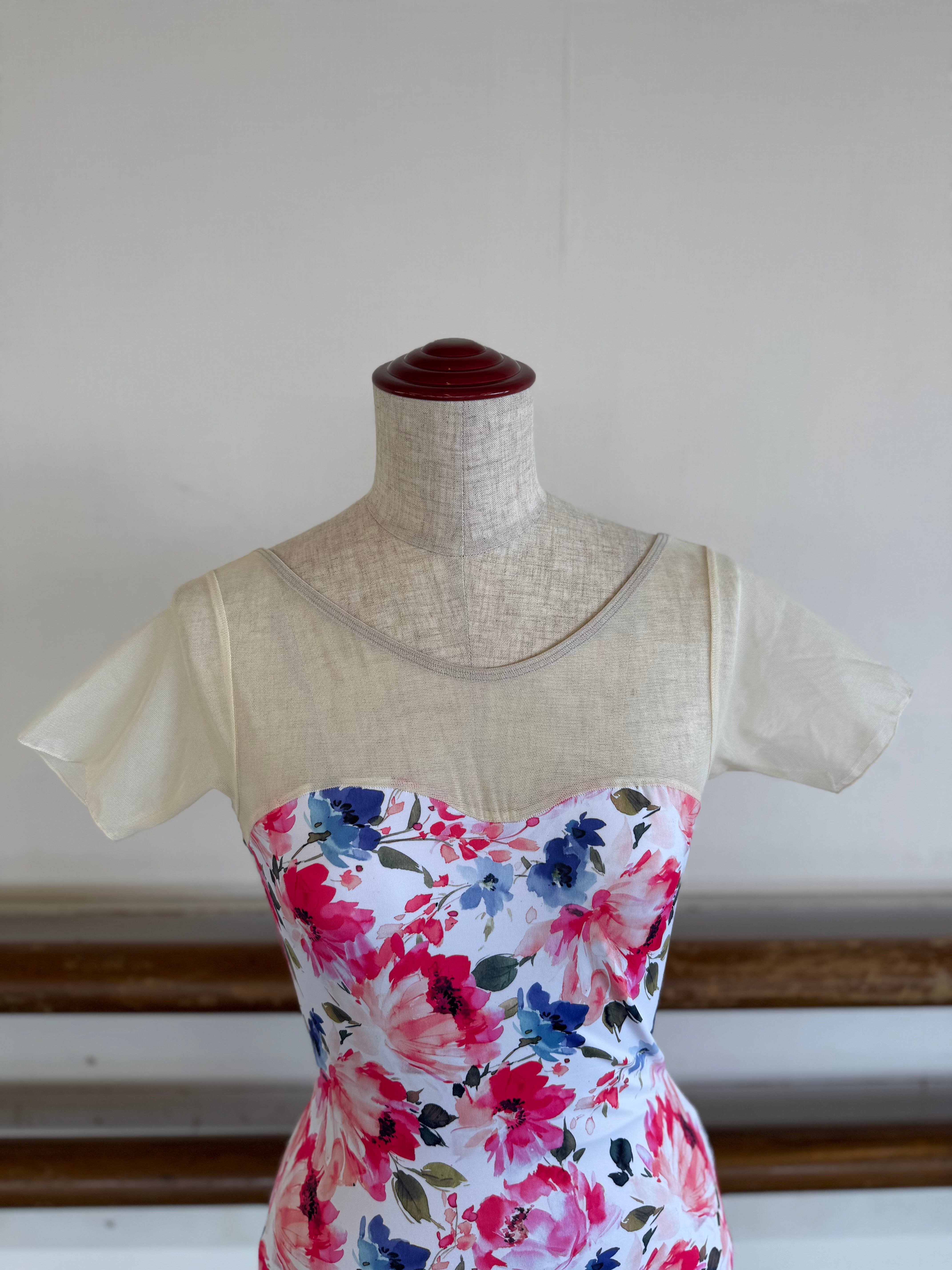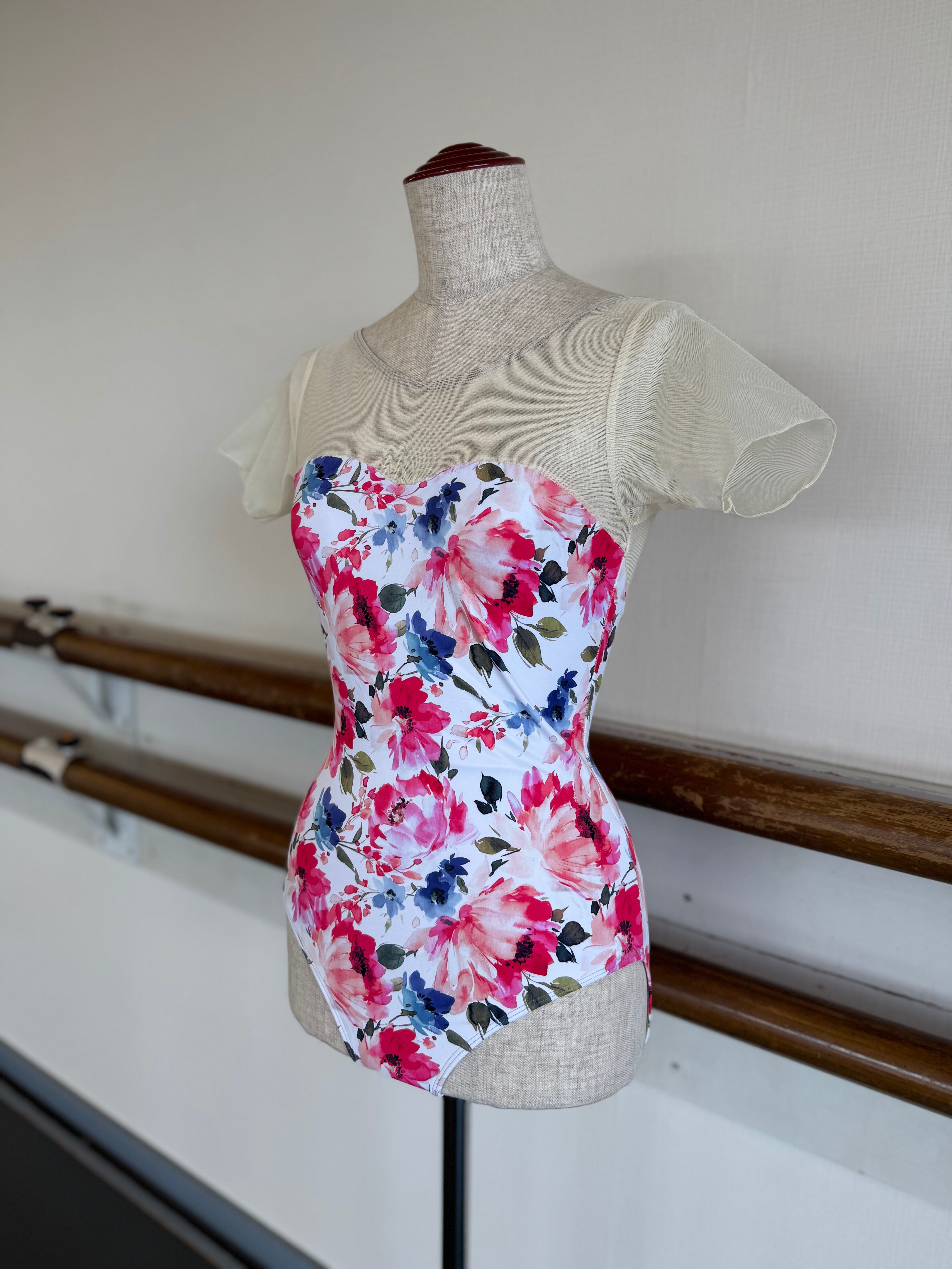 シアー生地の半袖デザインに、可愛らしい花柄を組み合わせたデザインです。