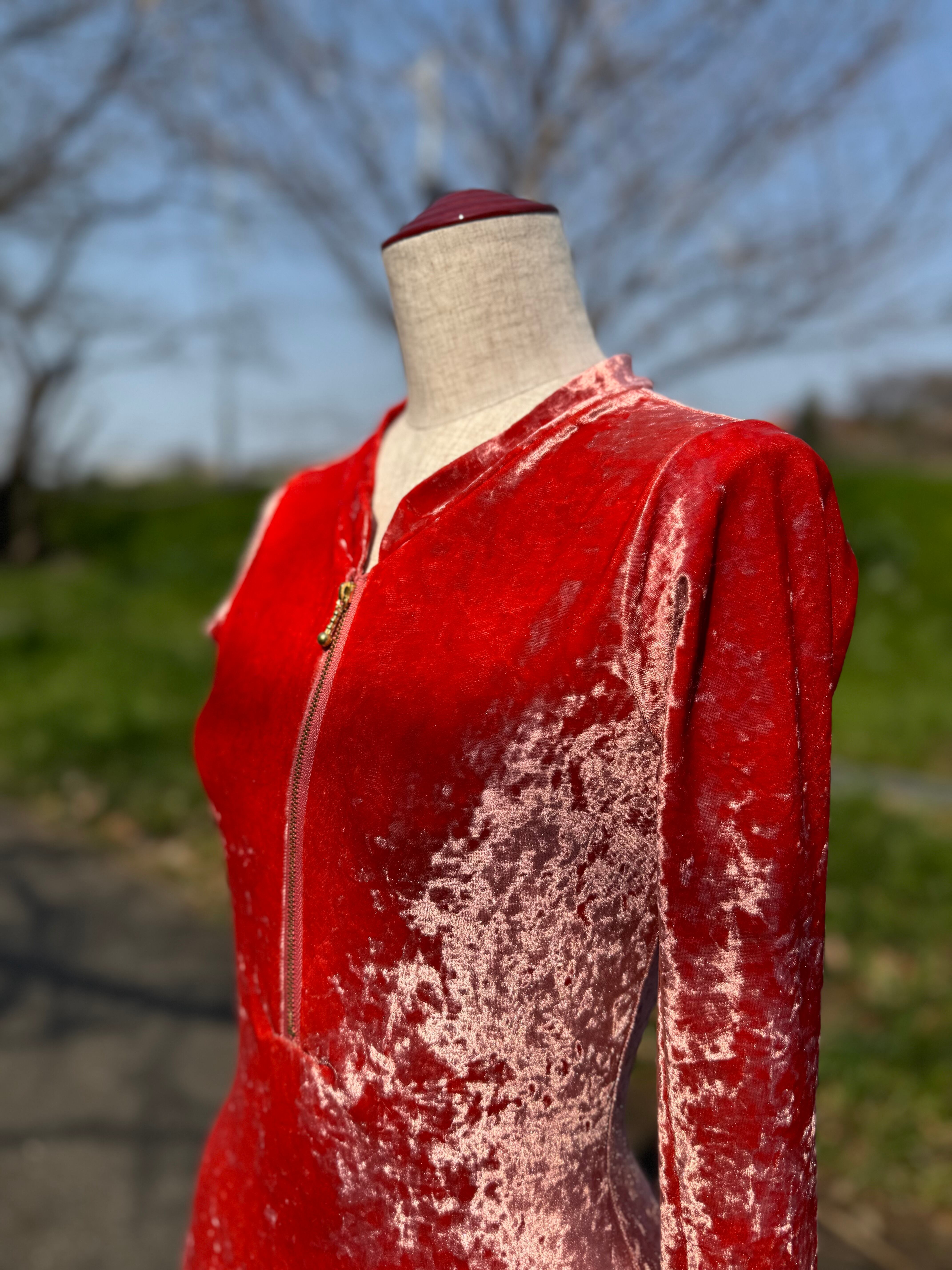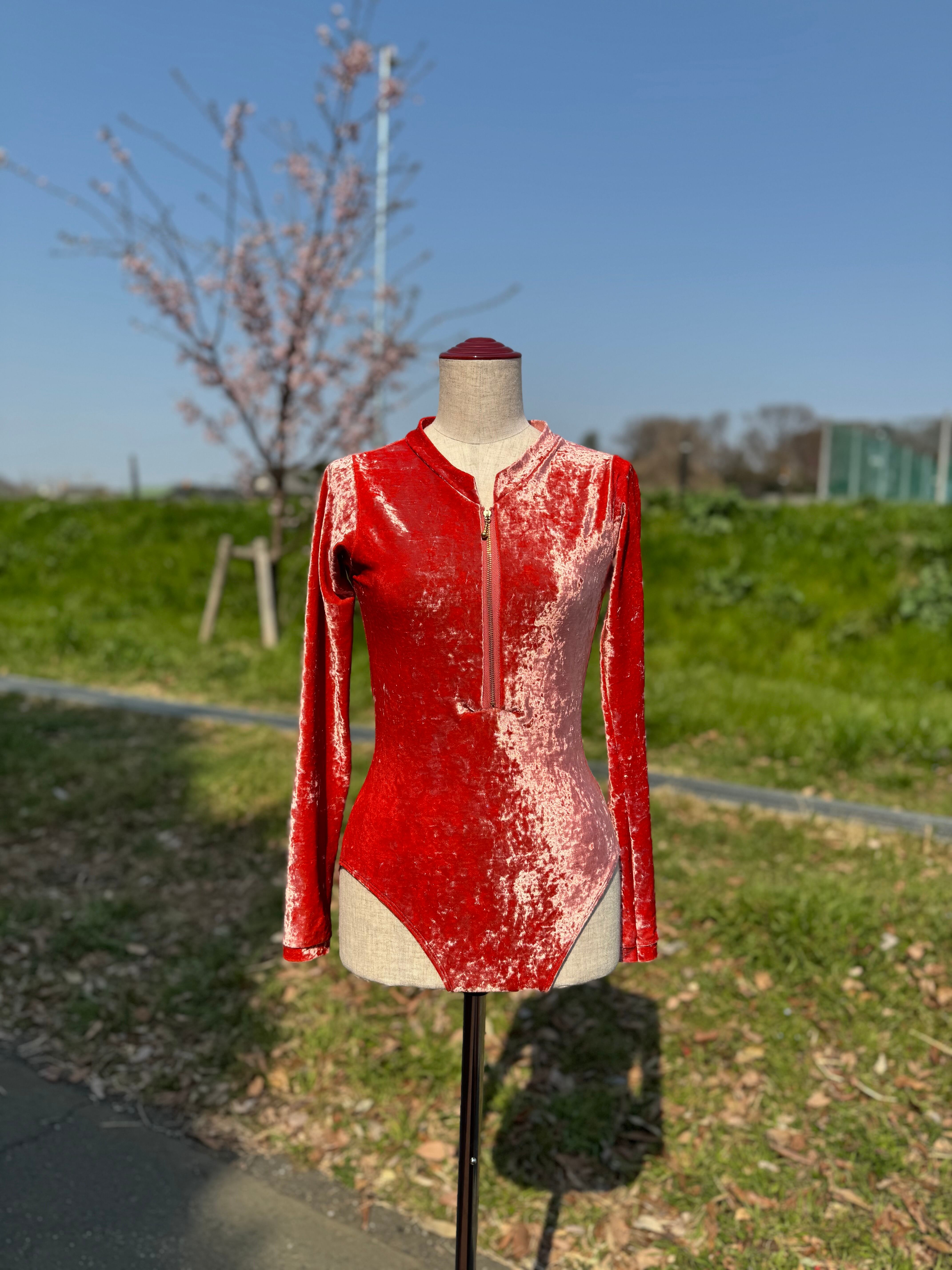 レオタード 長袖ジップ総ベロア レッド